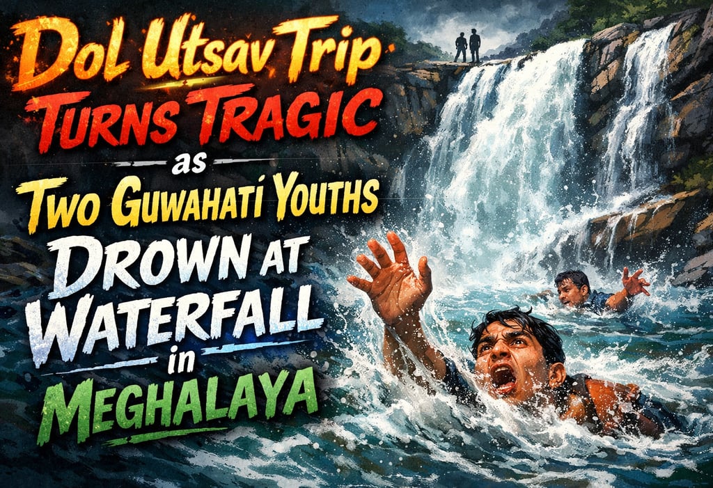 Meghalaya / Assam, India — The joyous celebrations of Dol Utsav ended in heartbreak on Tuesday, March 3, 2026, when two young men from Guwahati drowned at a scenic waterfall near the Assam–Meghalaya border during a festive outing with friends.