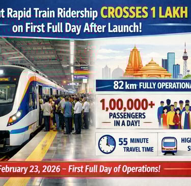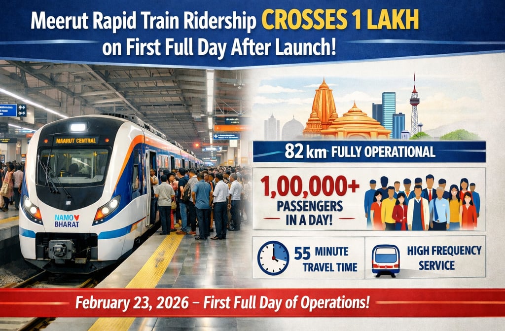 The Delhi–Ghaziabad–Meerut Namo Bharat (RRTS) corridor recorded more than 1 lakh commuters on its first full day of commercial operations, the National Capital Region Transport Corporation (NCRTC) said, marking the highest single-day ridership on the corridor so far.